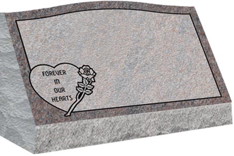 Slant come with a slanted polished face and rock pitched edges, serpentine top with a straight back and are installed on a concrete foundation or on a granite base.
